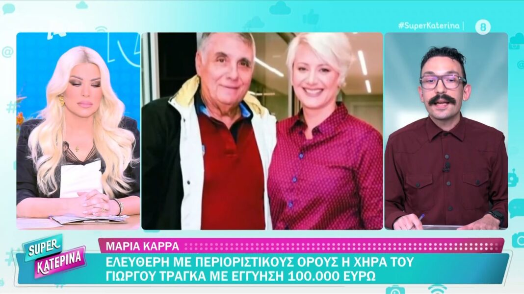 Η χήρα του Γιάννη Τράγκα, Μαρία Καρρά, αφέθηκε ελεύθερη με περιοριστικούς όρους, έπειτα από απόφαση του δικαστηρίου. Η εγγύηση που της επιβλήθηκε ανέρχεται σε 100.000 ευρώ, ενώ οι συνθήκες που συνόδευαν την απόφαση θα παρακολουθούνται στενά.