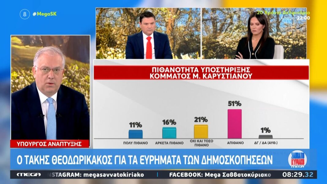 Ο Υπουργός Ανάπτυξης, Τάκης Θεοδωρικάκος, αναφέρθηκε σε πρόσφατα δημοσκοπικά ευρήματα, επισημαίνοντας ότι οι απαντήσεις που προκύπτουν υπέρ του Καρυστιανού είναι κυρίως συναισθηματικές. Ανέφερε ότι οι πολίτες αντιδρούν σε προσωπικά ζητήματα και όχι αναγκαστικά σε πολιτικές θέσεις.