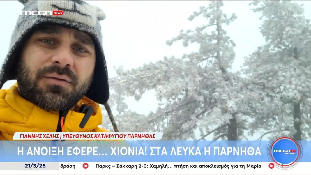 Η Πάρνηθα ντύθηκε στα λευκά, καθώς η άνοιξη έφερε απροσδόκητες χιονοπτώσεις στην περιοχή. Ο Γιάννης Χέλης, υπεύθυνος του καταφυγίου Μπάφι, αναφέρει ότι η χιονόπτωση έχει δημιουργήσει μια μαγευτική ατμόσφαιρα, προσελκύοντας φυσιολάτρες και επισκέπτες.