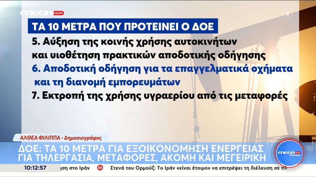 Η ΔΟΕ προτείνει μια σειρά από δέκα μέτρα για την εξοικονόμηση ενέργειας, εστιάζοντας σε τομείς όπως η τηλεργασία, οι μεταφορές και η μαγειρική. Αυτές οι στρατηγικές στοχεύουν στη μείωση της κατανάλωσης ενέργειας και στην προώθηση βιώσιμων πρακτικών που μπορούν να υιοθετηθούν από τους πολίτες.