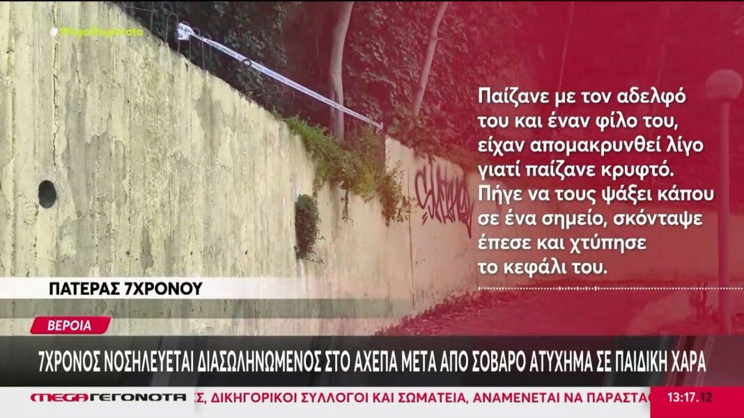 Ένα 7χρονο αγοράκι από τη Βέροια νοσηλεύεται σε κρίσιμη κατάσταση μετά από σοβαρό τραυματισμό σε παιδική χαρά. Ο πατέρας του, σε δηλώσεις του, εξέφρασε την αγωνία του για την κατάσταση της υγείας του γιου του, επισημαίνοντας την ανάγκη για περισσότερη ασφάλεια στους χώρους παιχνιδιού.