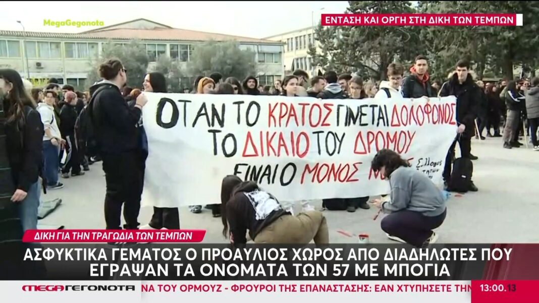 Δίκη Τεμπών: Ασφυκτικά γεμάτος ο προαύλιος χώρος από διαδηλωτές που έγραψαν τα ονόματα των 57 νεκρών