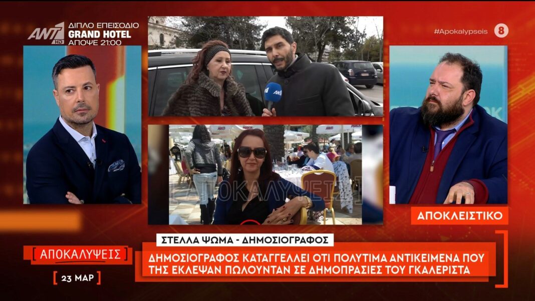 Η δημοσιογράφος Στέλλα Ψωμά καταγγέλλει ότι πολύτιμα αντικείμενα που της έκλεψαν βρέθηκαν να πωλούνται σε δημοπρασίες ενός γνωστού γκαλερίστα. Η ίδια αναφέρει ότι η κλοπή έλαβε χώρα υπό αδιευκρίνιστες συνθήκες, προκαλώντας σοβαρά ερωτήματα σχετικά με τη νόμιμη προέλευση αυτών των αντικειμένων.