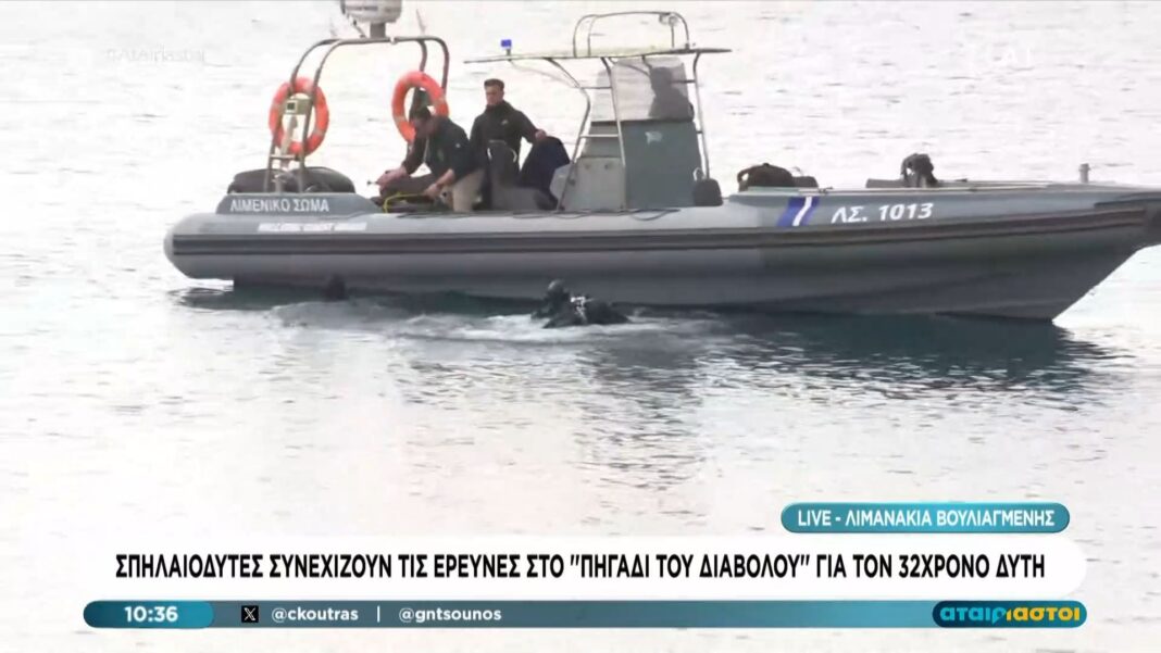 Οι έρευνες για τον 32χρονο δύτη που αγνοείται από το προηγούμενο Σαββατοκύριακο συνεχίζονται με αμείωτη ένταση. Σπηλαιοδύτες και ειδικές ομάδες διάσωσης έχουν επιστρατευτεί για να εξερευνήσουν το «πηγάδι του διαβόλου», μια περιοχή γνωστή για τις δύσκολες συνθήκες που επικρατούν.