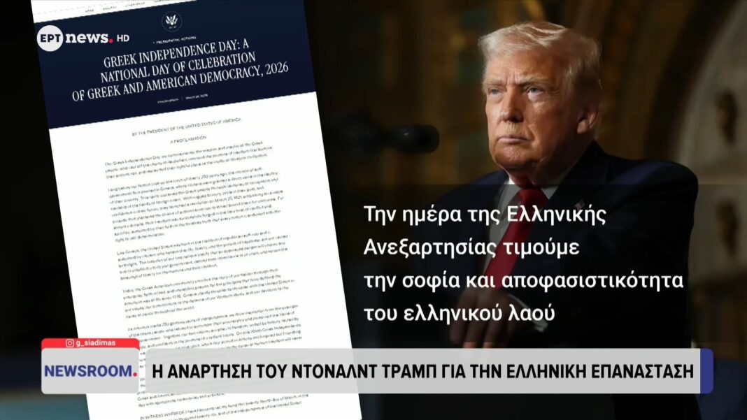 Ο Ντόναλντ Τραμπ ανακοίνωσε την ανακήρυξη της 25ης Μαρτίου 2026 ως «Ημέρα της Ελληνικής Ανεξαρτησίας: Εθνική Ημέρα Εορτασμού της Ελληνικής και Αμερικανικής Δημοκρατίας». Η...