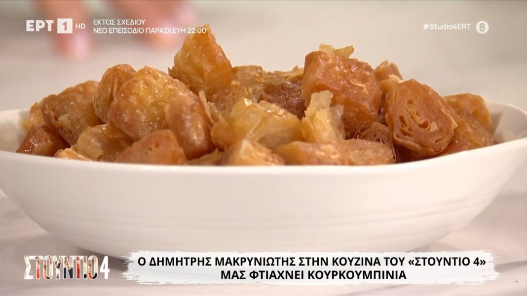 Ο Δημήτρης Μακρυνιώτης μας παρουσιάζει τη διαδικασία παρασκευής των παραδοσιακών κουρκουμπινιών, ένα γλυκό που ενσαρκώνει τη γεύση και την παράδοση. Με απλά υλικά, όπως φύλλα κρούστας και βούτυρο αγελάδος, δημιουργεί ένα λαχταριστό επιδόρπιο που ξεχειλίζει από γεύσεις.