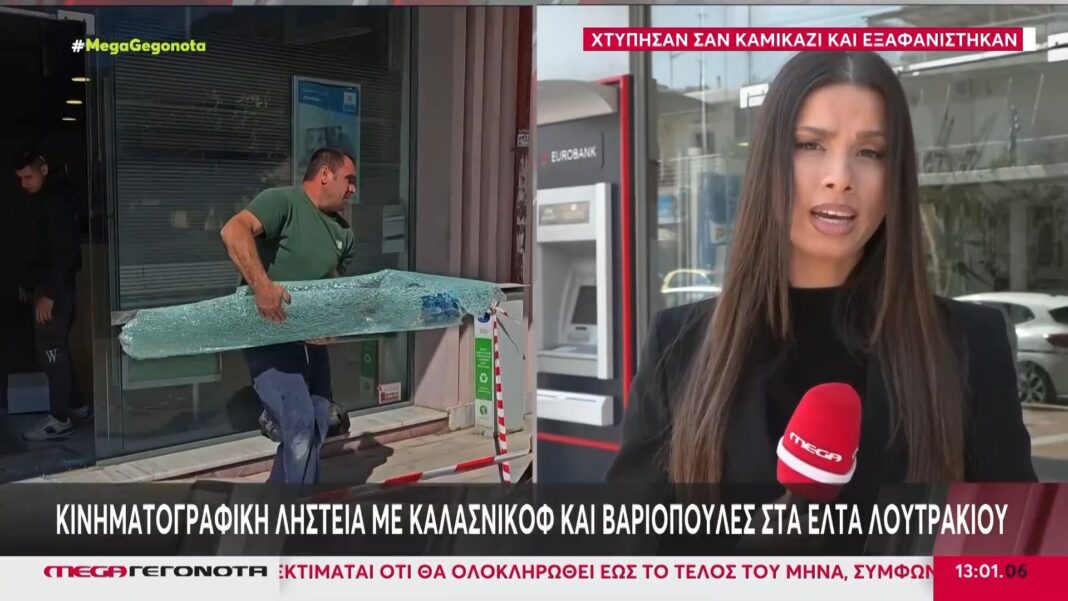 Στη χθεσινή κινηματογραφική ληστεία που σημειώθηκε στο υποκατάστημα των ΕΛΤΑ στο Λουτράκι, τρεις ένοπλοι δράστες εισέβαλαν στο κατάστημα, ακινητοποιώντας τους υπαλλήλους με καλάσνικοφ και βαριοπούλες. Οι ληστές κατάφεραν να αποσπάσουν το ποσό των 32.000 ευρώ πριν διαφύγουν από τον τόπο του εγκλήματος.