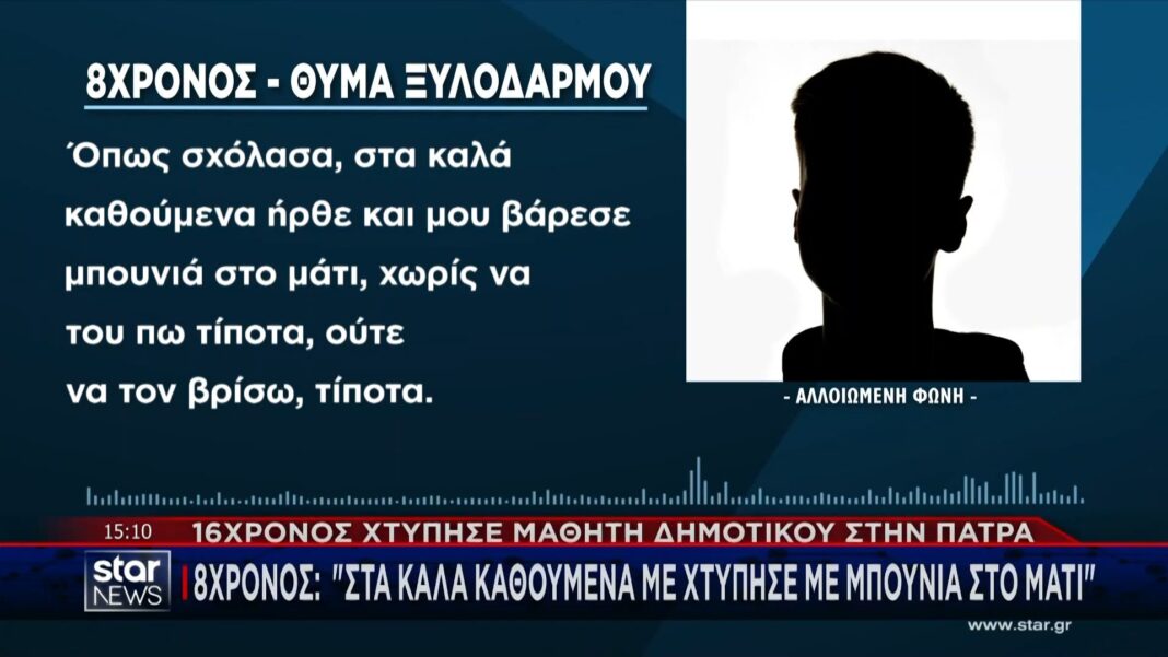Ένα 8χρονο αγόρι έγινε θύμα ξυλοδαρμού από έναν 16χρονο, προκαλώντας σοκ στην τοπική κοινωνία της Πάτρας. Ο μικρός μαθητής περιέγραψε την εμπειρία του, αναφέροντας ότι ο επιτιθέμενος τον χτύπησε χωρίς προειδοποίηση, αφήνοντάς τον φοβισμένο και σε κατάσταση πανικού.