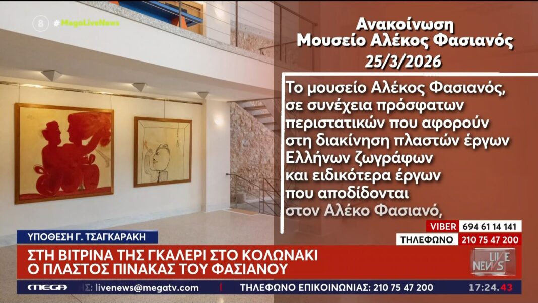 Σύμφωνα με πληροφορίες, ο Τσαγκαράκης έλαβε email από το μουσείο «Αλέκος Φασιανός» σχετικά με την ύπαρξη πλαστού πίνακα που εκτίθεται στη γκαλερί του. Ο πίνακας, ο οποίος φέρει την υπογραφή του διάσημου ζωγράφου, έχει προκαλέσει ανησυχία στους συλλέκτες και τους καλλιτεχνικούς κύκλους.