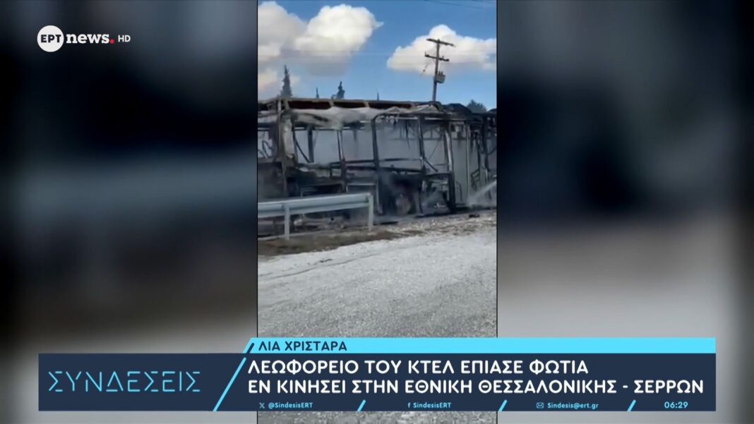 Λεωφορείο του ΚΤΕΛ, που εκτελούσε δρομολόγιο στην Εθνική Οδό Θεσσαλονίκης – Σερρών, πήρε φωτιά ενώ ήταν εν κινήσει. Οι επιβάτες αντέδρασαν άμεσα, με αποτέλεσμα να αποβιβαστούν εγκαίρως και να μην υπάρξουν τραυματισμοί.