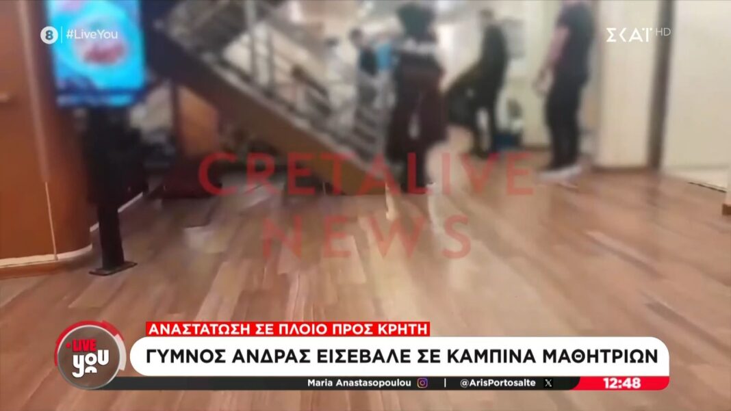 Αναστάτωση προκλήθηκε σε πλοίο που κατευθυνόταν προς Κρήτη, όταν ένας 45χρονος άνδρας εισήλθε γυμνός σε καμπίνα μαθητριών. Οι επιβάτες αντέδρασαν άμεσα, προκαλώντας πανικό και αναστάτωση ανάμεσα στους επιβαίνοντες.