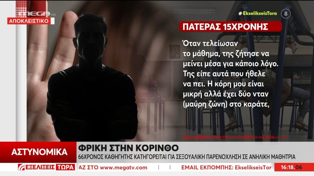 Μια 14χρονη μαθήτρια στην Κόρινθο κατήγγειλε ότι υπήρξε θύμα σεξουαλικής παρενόχλησης από τον 66χρονο καθηγητή της. Η υπόθεση έχει προκαλέσει σοκ στην τοπική κοινωνία, με τις αρχές να διεξάγουν έρευνα για τα περιστατικά που αναφέρθηκαν.