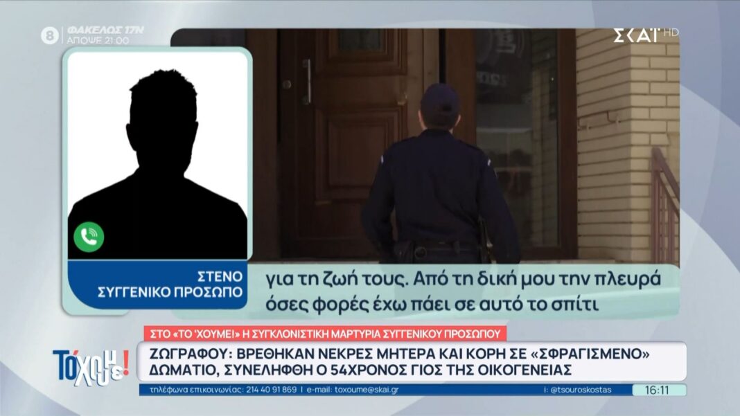 Σοκ έχει προκαλέσει η είδηση ότι μητέρα και κόρη βρέθηκαν νεκρές σε ένα κλειστό δωμάτιο στην περιοχή του Ζωγράφου. Οι αρχές προχώρησαν στη σύλληψη του 54χρονου γιου της οικογένειας, ο οποίος φέρεται να είναι ο τελευταίος που τις είδε ζωντανές.