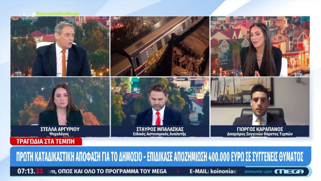 Πρόσφατη απόφαση του Διοικητικού Πρωτοδικείου επιρρίπτει ευθύνες στο ελληνικό Δημόσιο για το σιδηροδρομικό δυστύχημα στα Τέμπη, αποζημιώνοντας τους τέσσερις ενάγοντες με 400.000€. Ο Γιώργος Καραπάνος, δικηγόρος των συγγενών ενός θύματος, τόνισε ότι η απόφαση αναγνωρίζει την αμέλεια του Δημοσίου, το οποίο γνώριζε τους κινδύνους αλλά δεν έλαβε μέτρα.