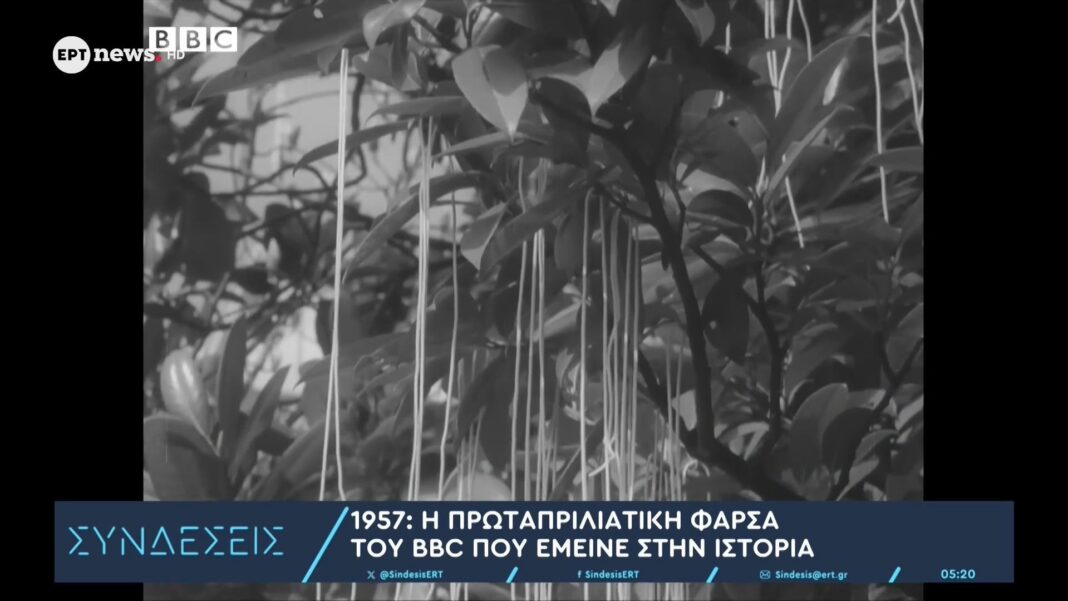 Στις 1 Απριλίου 1957, το BBC παρουσίασε μια μοναδική φάρσα που συνέλαβε την προσοχή του κοινού, αναφέροντας ότι οι ελβετικές γυναίκες μάζευαν μακαρόνια από τα δέντρα. Η εκπομπή, που συνδύαζε χιούμορ και πειστική αφήγηση, προκάλεσε αναστάτωση και θαυμασμό, καθώς πολλοί θεατές πίστεψαν ότι η ιστορία ήταν αληθινή.