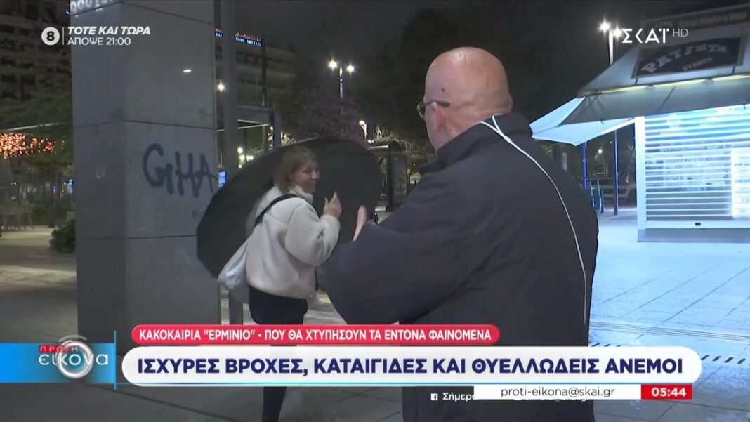 Ο ρεπόρτερ του ΣΚΑΪ βρέθηκε σε πεζόδρομο, όπου παρατήρησε μία περαστική να κρατάει ομπρέλα. Αφού την πλησίασε, της ανέφερε με χιούμορ ότι δεν φαίνεται να βρέχει, καθώς το μόνο που ακούγεται είναι ένας ελαφρύς ήχος βροχής.