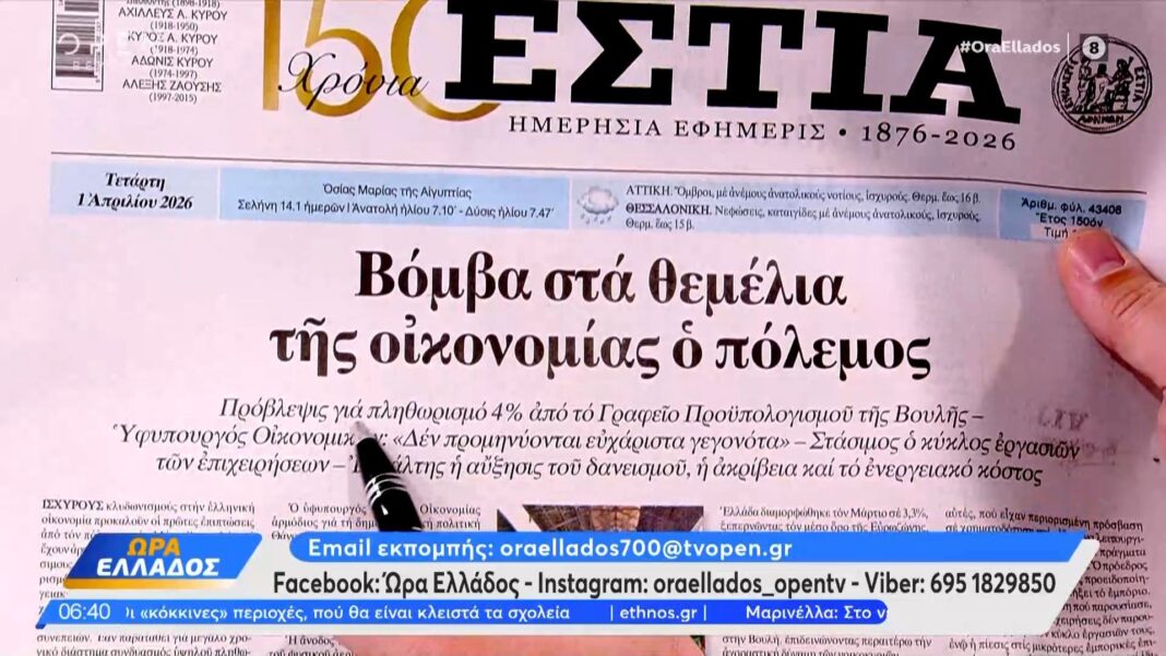 Σήμερα, 1 Απριλίου 2026, οι εφημερίδες καλύπτουν μια ποικιλία σημαντικών θεμάτων που απασχολούν την κοινή γνώμη. Από τις εξελίξεις στην πολιτική σκηνή μέχρι τις τελευταίες ειδήσεις στον τομέα της οικονομίας, οι τίτλοι αποτυπώνουν τις κυριότερες ανησυχίες των πολιτών.
