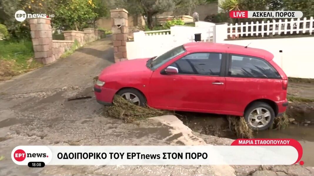Στον Πόρο, οι έντονες βροχοπτώσεις προκάλεσαν σοβαρές καταστροφές, με δρόμους να καταρρέουν και αυτοκίνητα να παρασύρονται από τα ορμητικά νερά. Οι κάτοικοι της περιοχής προσπαθούν να διαχειριστούν τις συνέπειες της κακοκαιρίας, ενώ οι αρχές καταβάλλουν προσπάθειες για την αποκατάσταση της κυκλοφορίας.