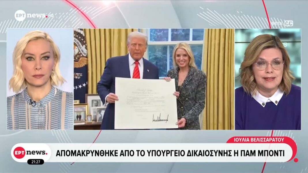 Η Παμ Μπόντι απομακρύνθηκε από τη θέση της στο Υπουργείο Δικαιοσύνης, σύμφωνα με πληροφορίες από αμερικανικά ΜΜΕ. Η απόφαση αυτή φαίνεται να σχετίζεται με τους χειρισμούς της στην υπόθεση του Τζέφρι Έπστιν, που έχει προκαλέσει σφοδρές αντιδράσεις και δημόσιο σάλο.