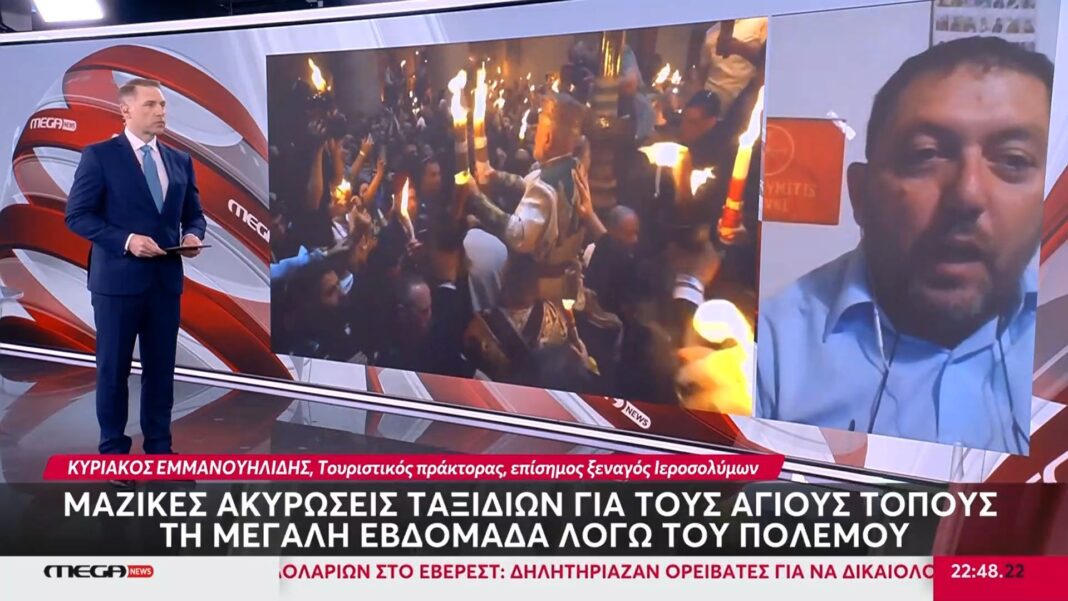 Μαζικές ακυρώσεις ταξιδιών παρατηρούνται στους Αγίους Τόπους λόγω της κλιμάκωσης της έντασης στην περιοχή. Ο Κυριάκος Εμμανουηλίδης, τουριστικός πράκτορας και επίσημος ξεναγός Ιεροσολύμων, αναφέρεται στις δυσκολίες που αντιμετωπίζουν οι επισκέπτες και οι τουριστικοί φορείς.