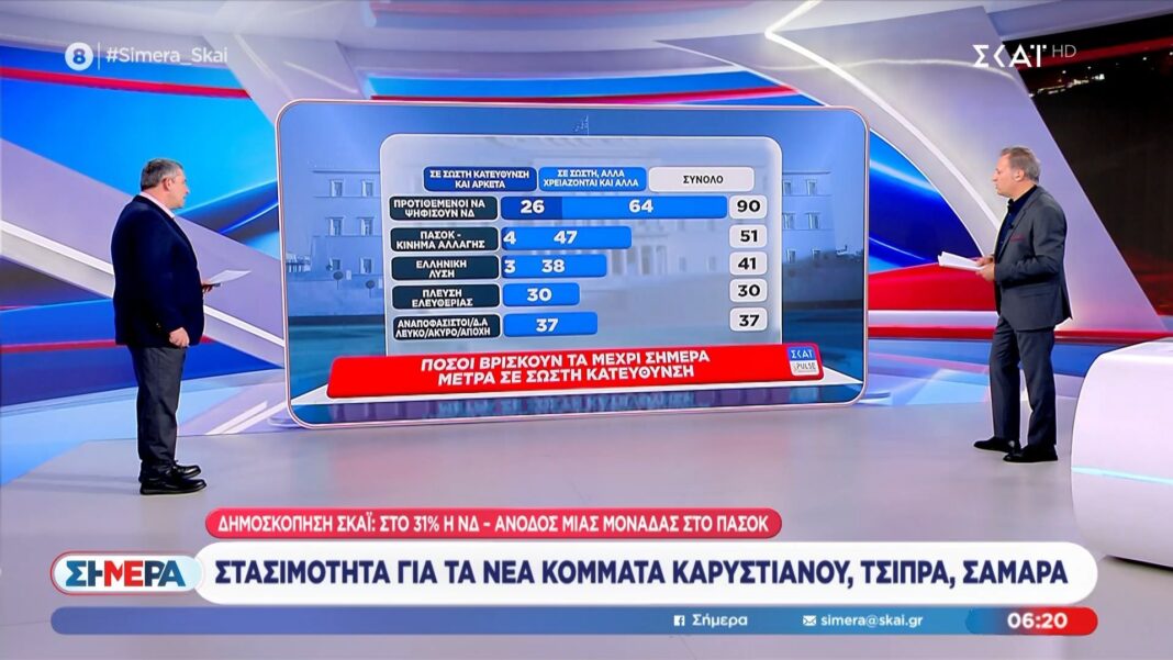 Σύμφωνα με πρόσφατη δημοσκόπηση του ΣΚΑΪ, η Νέα Δημοκρατία παραμένει σταθερή στο 31%, διατηρώντας την πρωτοκαθεδρία στην πολιτική σκηνή. Σημαντική είναι η άνοδος μιας μονάδας του ΠΑΣΟΚ, που δείχνει μια μικρή αλλά σταθερή τάση υποστήριξης από τους ψηφοφόρους.