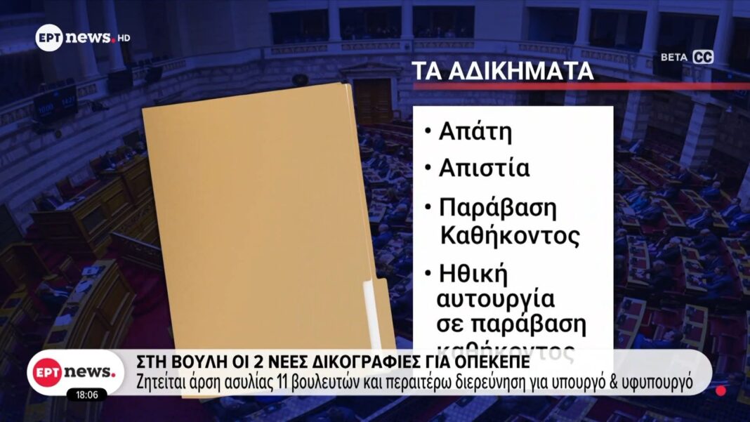 Η Βουλή εξετάζει αιτήσεις άρσης ασυλίας 11 βουλευτών για παρατυπίες στον ΟΠΕΚΕΠΕ, εμπλέκοντας επίσης υπουργό και υφυπουργό, προκαλώντας πολιτικές αντιδράσεις.