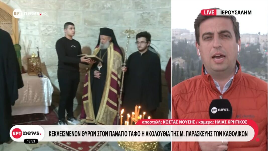 Κεκλεισμένων θυρών πραγματοποιήθηκε η Ακολουθία της Μεγάλης Παρασκευής των Καθολικών στον Πανάγιο Τάφο στην Ιερουσαλήμ. Η τελετή αυτή, που παραδοσιακά συγκεντρώνει πλήθος πιστών, φέτος περιορίστηκε λόγω των μέτρων ασφαλείας και των υγειονομικών κανονισμών.