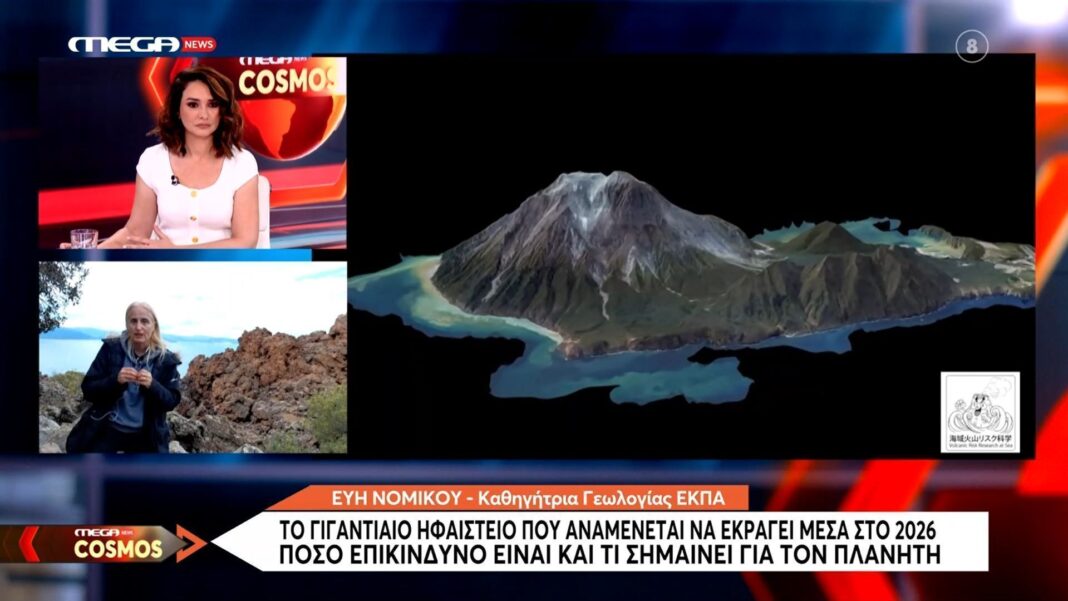 Η καθηγήτρια Γεωλογίας Εύη Νομικού αναλύει την επικείμενη έκρηξη ενός γιγαντιαίου υποθαλάσσιου ηφαιστείου, που εκτιμάται ότι θα συμβεί το 2026. Η έκρηξη αυτή ενδέχεται να προκαλέσει σοβαρές συνέπειες για το περιβάλλον και την ανθρωπότητα, καθώς η δύναμή της μπορεί να επηρεάσει κλιματολογικές συνθήκες και να προκαλέσει τσουνάμι.