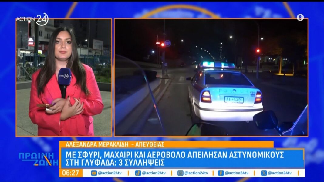 Στη Γλυφάδα, τρεις άνδρες συνελήφθησαν μετά από επεισόδιο που εκτυλίχθηκε με απειλές κατά αστυνομικών. Οι δράστες, οπλισμένοι με σφυρί, μαχαίρι και αεροβόλο, προσπάθησαν να επιτεθούν στους αστυνομικούς κατά τη διάρκεια ελέγχου.