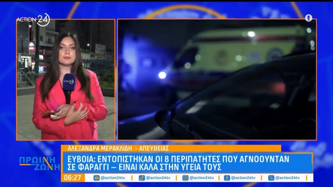 Οκτώ περιπατητές που είχαν αγνοηθεί σε φαράγγι της Εύβοιας εντοπίστηκαν ασφαλείς και καλά στην υγεία τους. Οι αρχές κινητοποιήθηκαν άμεσα, αξιοποιώντας ομάδες διάσωσης και τοπικούς εθελοντές για την αναζήτησή τους.