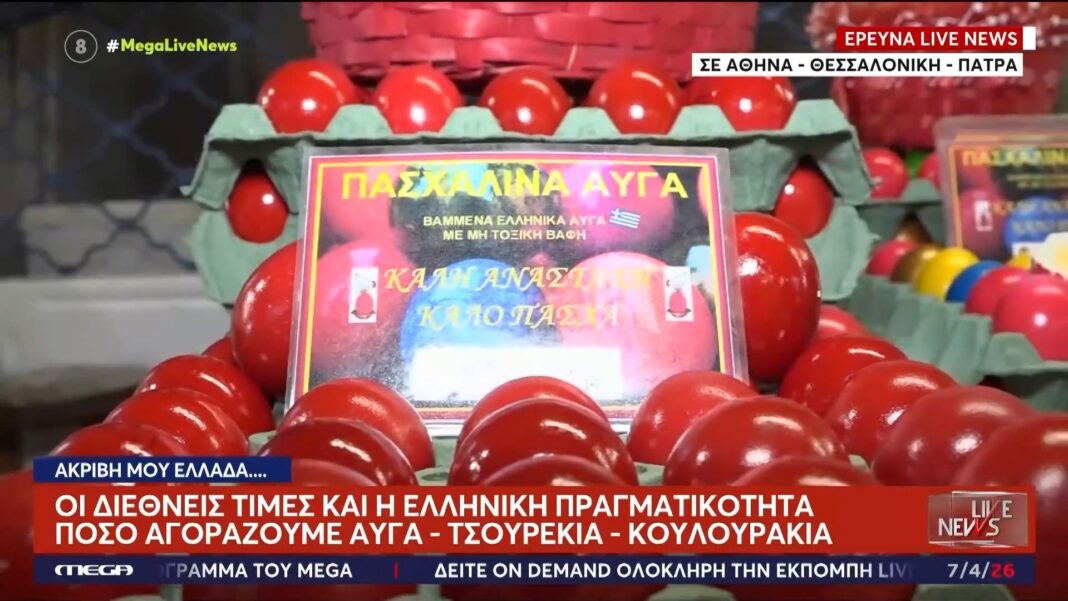 Η έρευνα του Live News αναδεικνύει τις σημαντικές αυξήσεις στις τιμές αβγών, τσουρεκιών και κουλουρακίων, ενόψει του Πάσχα, στις μεγάλες πόλεις της χώρας. Οι καταναλωτές παρατηρούν ότι οι τιμές έχουν φτάσει σε επίπεδα υψηλότερα από πέρυσι, επηρεάζοντας τις αγοραστικές τους επιλογές.