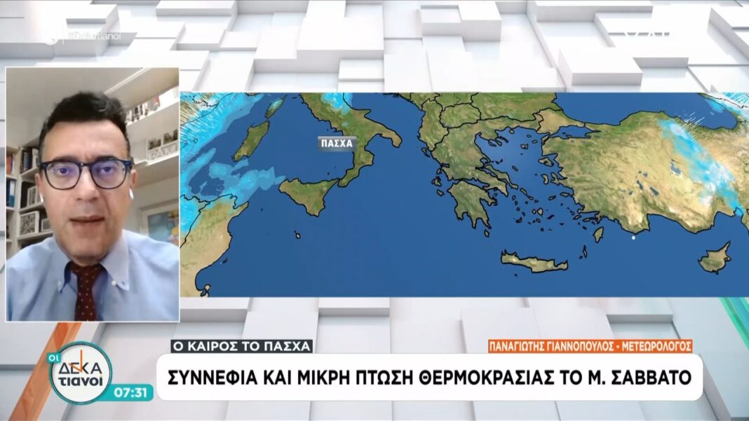 Το Μ. Σάββατο αναμένονται συννεφιά και μικρή πτώση της θερμοκρασίας, με τις περισσότερες περιοχές να βιώνουν δροσερές συνθήκες. Οι τοπικές βροχές είναι πιθανές, κυρίως στις ορεινές περιοχές, ενώ οι άνεμοι θα πνέουν από βόρειες κατευθύνσεις.
