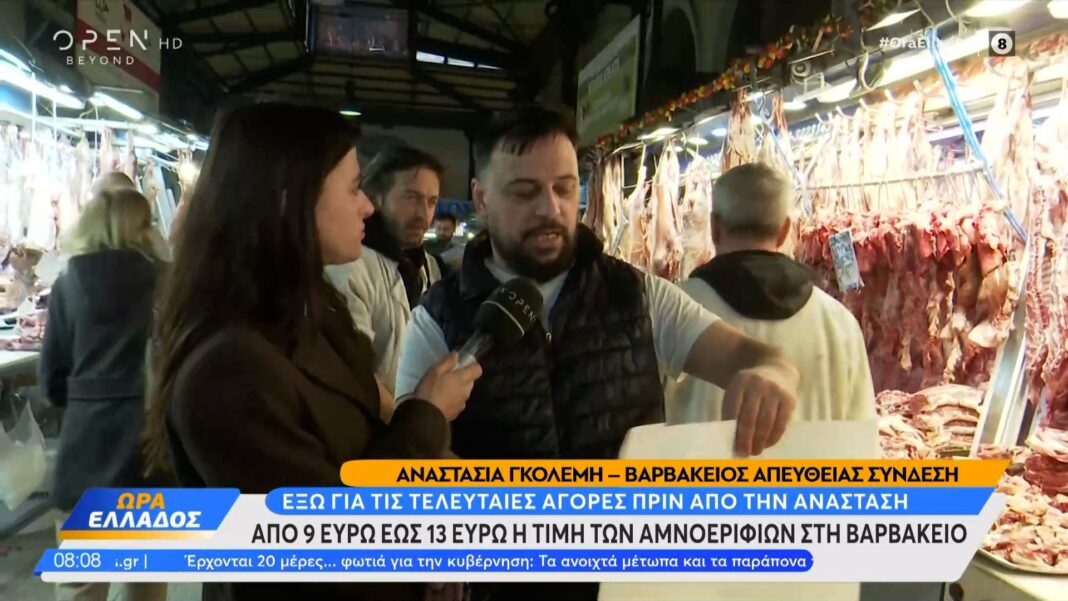 Οι καταναλωτές στη Βαρβάκειο εκμεταλλεύονται τις καλύτερες των προσδοκιών τιμές για πασχαλινά αμνοερίφια, με άφθονο απόθεμα για την εορταστική περίοδο.