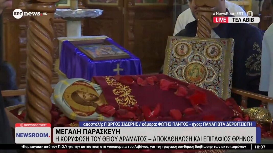 Στον Ελληνορθόδοξο ναό στο Τελ Αβίβ, οι πιστοί συγκεντρώθηκαν για να παρακολουθήσουν τον Επιτάφιο Θρήνο, τη σημαντική τελετή της Μεγάλης Παρασκευής. Η ατμόσφαιρα ήταν γεμάτη κατάνυξη, καθώς οι παραδοσιακοί ύμνοι συνδύαζαν τη θλίψη και την ελπίδα της Ανάστασης.