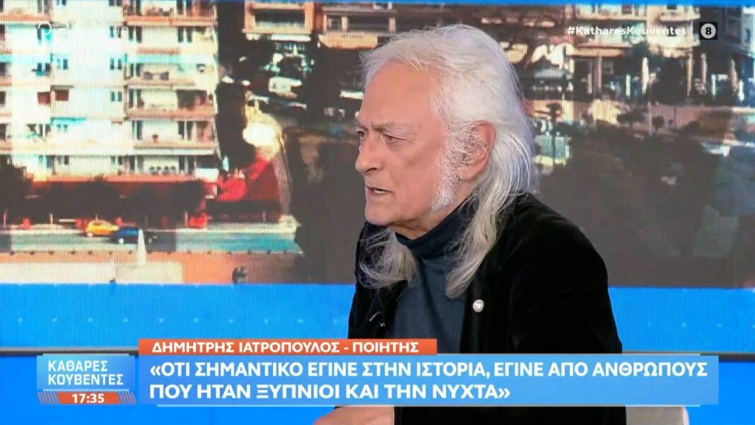 Ο ποιητής Δημήτρης Ιατρόπουλος συμμετείχε στην εκπομπή «Καθαρές κουβέντες», όπου εξέφρασε τις απόψεις του για τη σημασία της αφύπνισης στο κοινωνικό και πολιτισμικό πεδίο. Αναφέρθηκε στα πάθη που βιώνουν οι άνθρωποι και στη διαδικασία της σταύρωσής τους, υπογραμμίζοντας την ανάγκη για συνειδητοποίηση και δράση.
