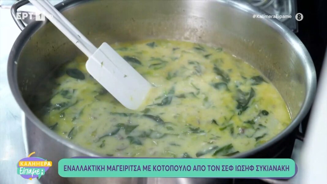 Ο σεφ Ιωάννης Συκιανάκης προτείνει μια εναλλακτική συνταγή για μαγειρίτσα, χρησιμοποιώντας κοτόπουλο και φρέσκα υλικά. Η συνταγή περιλαμβάνει φιλέτο μπούτι και συκωτάκια κοτόπουλου, συνδυασμένα με σπανάκι, μαρούλι και αρωματικά όπως άνηθο και φρέσκο κρεμμύδι.