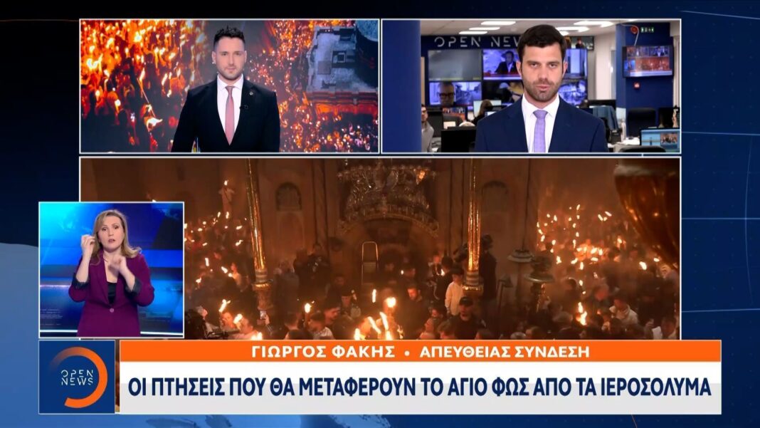 Η ελληνική αποστολή παρέλαβε το Άγιο Φως από τον Ελληνορθόδοξο Πατριάρχη Ιεροσολύμων, Γιώργο Φακή. Το φως θα μεταφερθεί πρώτα στο μετόχι του Παναγίου Τάφου, που βρίσκεται στο ναό Αγίων Αναργύρων στην Πλάκα.