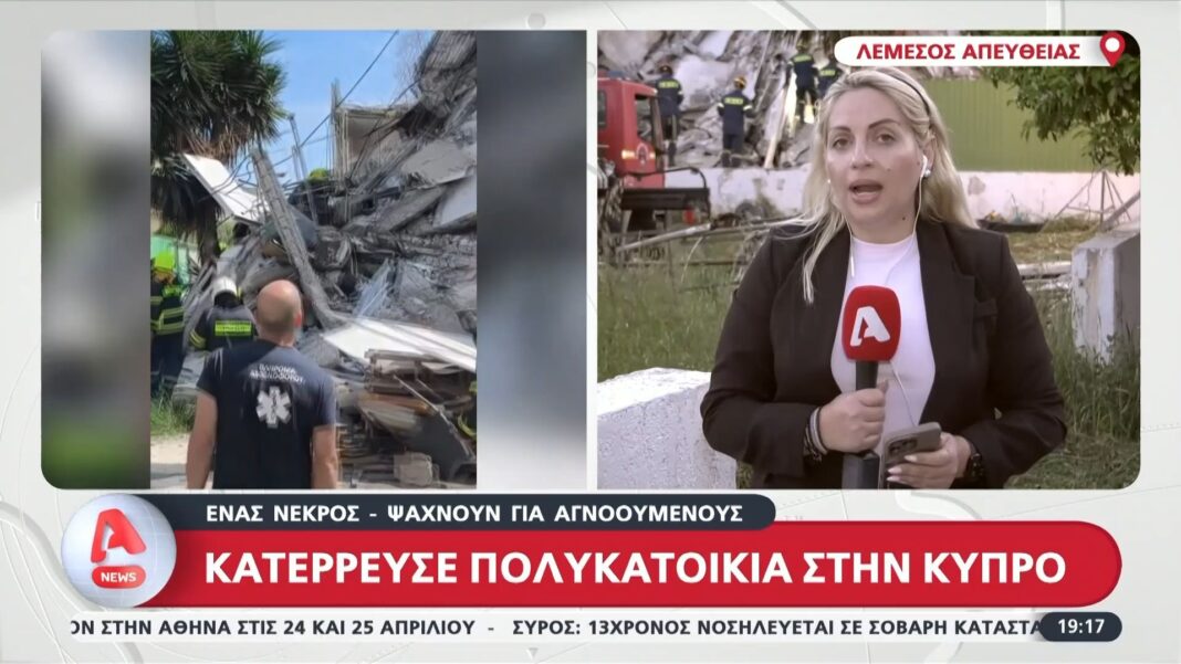 Κατέρρευσε πολυκατοικία στην Κύπρο, προκαλώντας σοκ και θλίψη στην τοπική κοινωνία. Μέχρι στιγμής, έχει επιβεβαιωθεί ο θάνατος ενός ατόμου, ενώ οι αρχές συνεχίζουν τις έρευνες για τον εντοπισμό πιθανών αγνοουμένων.