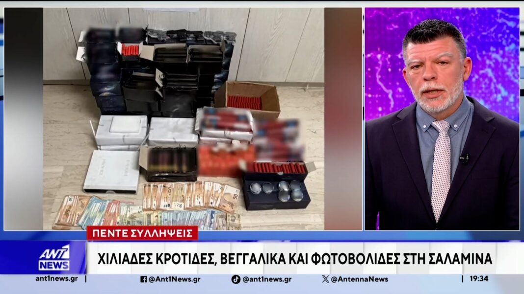Στην Σαλαμίνα εντοπίστηκαν χιλιάδες κροτίδες, βεγγαλικά και φωτοβολίδες κατά τη διάρκεια αστυνομικής επιχείρησης. Οι αρχές προχώρησαν στη σύλληψη δύο πωλητών, οι οποίοι φέρονται να διακινούσαν τα παράνομα προϊόντα, ενώ οι τρεις αγοραστές βρίσκονται επίσης αντιμέτωποι με τη δικαιοσύνη.