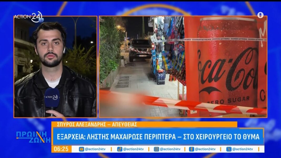 Άγνωστος επιτέθηκε σε περιπτερά στα Εξάρχεια προκαλώντας πανικό, ενώ οι αρχές αναζητούν το δράστη μετά τη διαφυγή του. Η υγεία του θύματος παραμένει κρίσιμη.