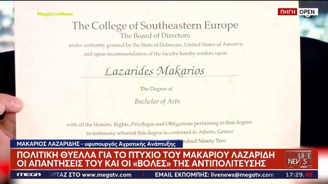 Στην τελευταία δημόσια εμφάνιση του Υφυπουργού Αγροτικής Ανάπτυξης, Μακάριου Λαζαρίδη, οι δηλώσεις του σχετικά με το πτυχίο του προκάλεσαν έντονες αντιδράσεις. Ο Λαζαρίδης υποστήριξε ότι δεν έχει υπάρξει ποτέ κρατικοδίαιτος, απαντώντας στις κατηγορίες της αντιπολίτευσης που αμφισβητούν την ακαδημαϊκή του επάρκεια.
