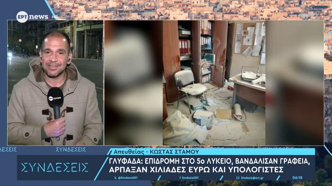 Άγνωστοι διαρρήκτες λεηλάτησαν το συγκρότημα του 5ου Γυμνασίου και Λυκείου Γλυφάδας, προκαλώντας σοβαρές ζημιές και κλέβοντας υπολογιστές και χρηματικό ποσό που έφτανε τα 8.000 ευρώ. Οι δράστες παραβίασαν την κεντρική πύλη και το γραφείο του διευθυντή, ενώ έσπασαν τζάμια, πέταξαν μπογιές και έγραψαν συνθήματα στους τοίχους.