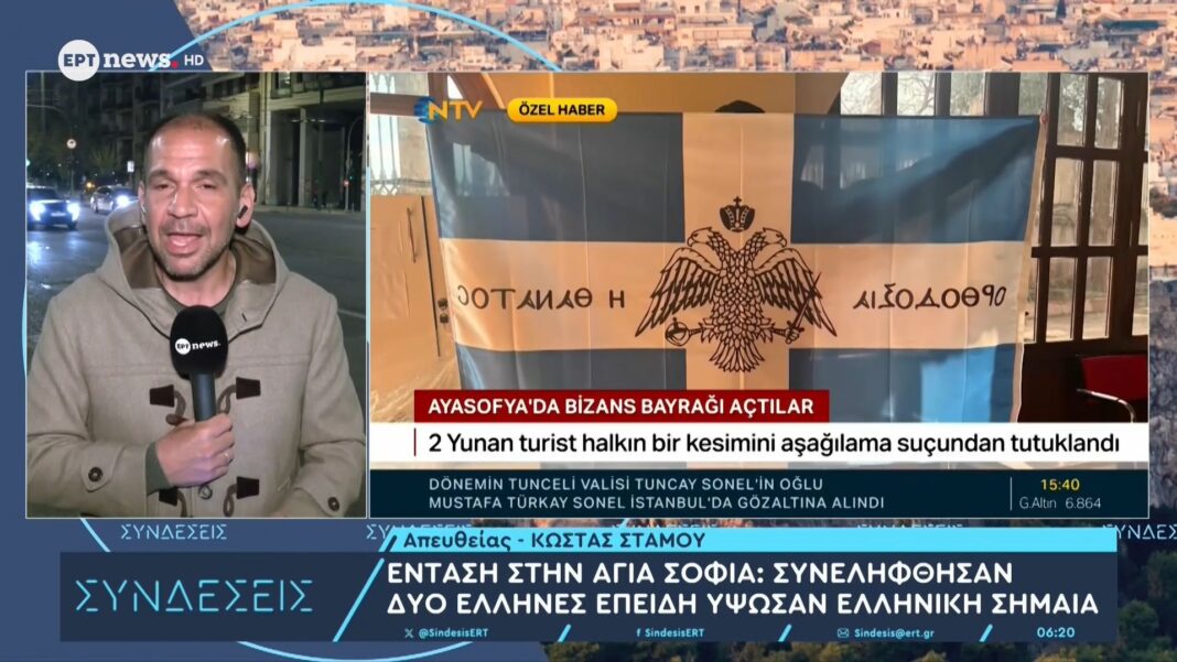 Δύο Έλληνες πολίτες συνελήφθησαν στην Αγία Σοφία, καθώς ύψωσαν ελληνική σημαία, προκαλώντας αναστάτωση στην περιοχή. Η αστυνομία επενέβη άμεσα, προκειμένου να αποτρέψει περαιτέρω εντάσεις και να διασφαλίσει την ασφάλεια των επισκεπτών.