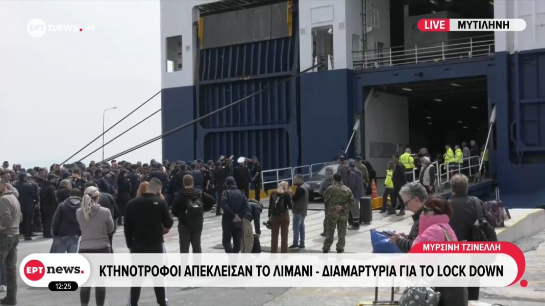 Κτηνοτρόφοι στη Μυτιλήνη αποκλείουν λιμάνι, ζητούν κυβερνητική στήριξη λόγω lockdown που πλήττει την τοπική οικονομία και τη διανομή προϊόντων.
