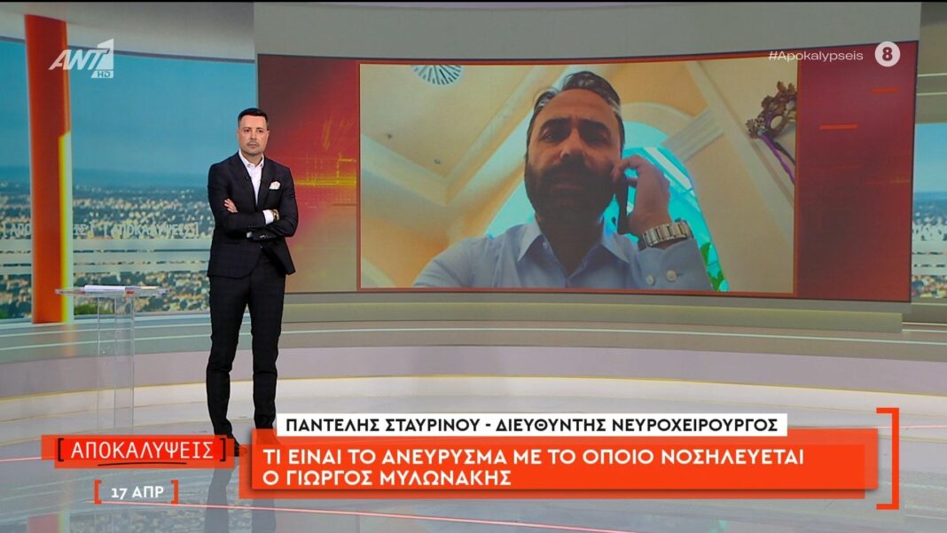 Ο Παντελής Σταυρινού, διευθυντής νευροχειρούργος, εξηγεί την κατάσταση του Γιώργου Μυλωνάκη, ο οποίος νοσηλεύεται λόγω ανευρύσματος. Το ανεύρυσμα είναι μια παθολογική διόγκωση ενός αγγείου, που μπορεί να προκαλέσει σοβαρές επιπλοκές, αν δεν αντιμετωπιστεί εγκαίρως.
