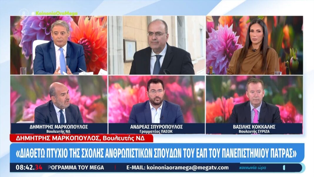 Ο Δημήτρης Μαρκόπουλος, βουλευτής της Νέας Δημοκρατίας, δήλωσε ότι δεν πρόκειται να επιδείξει τα πτυχία του προκειμένου να ικανοποιήσει τις απαιτήσεις της πολιτικής αντιπαράθεσης. Η τοποθέτησή του έγινε σε συζήτηση στην εκπομπή «Κοινωνία Ωρα MEGA», όπου συμμετείχαν επίσης ο γραμματέας του ΠΑΣΟΚ, Ανδρέας Σπυρόπουλος, και ο βουλευτής του ΣΥΡΙΖΑ, Βασίλης Κόκκαλης.