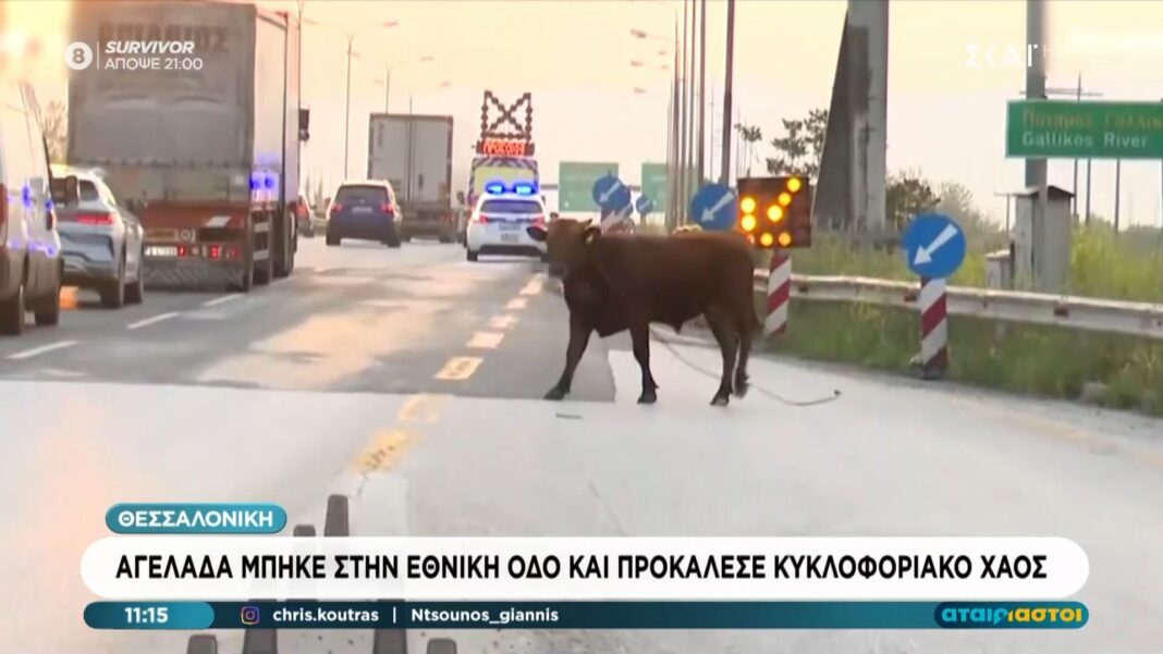 Αγελάδα που ξέφυγε από τον ιδιοκτήτη της προκάλεσε σημαντικά προβλήματα στην κυκλοφορία στην Εθνική Οδό Θεσσαλονίκης. Το ζώο μπήκε στον δρόμο, οδηγώντας σε μποτιλιάρισμα και καθυστερήσεις για τους οδηγούς που επιχειρούσαν να περάσουν από την περιοχή.