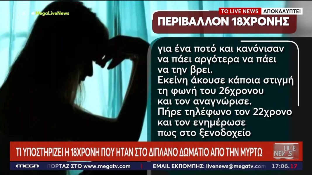 Η 18χρονη που βρισκόταν στο διπλανό δωμάτιο από τη Μυρτώ καταθέτει την εμπειρία της σχετικά με την πολύκροτη υπόθεση που έχει συγκλονίσει την κοινή γνώμη. Η μαρτυρία της φωτίζει άγνωστες πτυχές των γεγονότων, προσφέροντας μια διαφορετική οπτική για το περιστατικό.