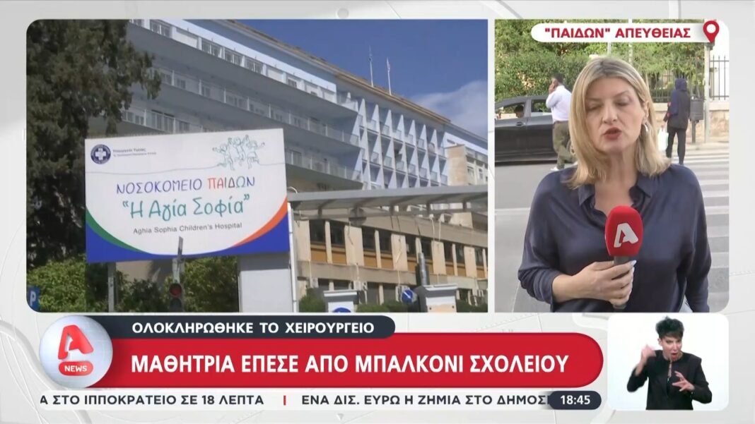 Η μαθήτρια που υπέστη σοβαρό τραυματισμό μετά την πτώση της από μπαλκόνι σχολείου, υποβλήθηκε σε πολύωρη χειρουργική επέμβαση. Οι γιατροί εργάστηκαν ακούραστα για να σταθεροποιήσουν την κατάσταση της, ενώ οι επόμενες ώρες είναι κρίσιμες για την ανάρρωσή της.