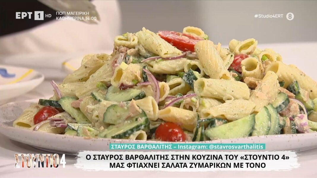 Ο Σταύρος Βαρθαλίτης μας παρουσιάζει μια γευστική σαλάτα ζυμαρικών με τόνο, ιδανική για ελαφρύ γεύμα ή εορταστικό τραπέζι. Η συνταγή περιλαμβάνει ριγκατόνι, φρέσκα λαχανικά και αρωματικά υλικά, προσφέροντας μια δροσερή και υγιεινή επιλογή.
